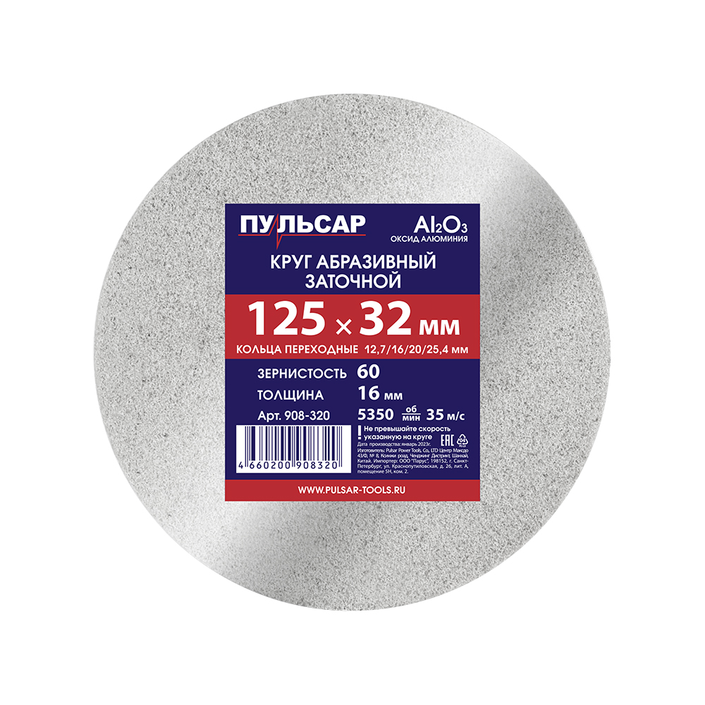 Диск абразивный для точила ПУЛЬСАР 125 х 32 х 16 мм F 60 белый (Al2O3) + кольца переходные