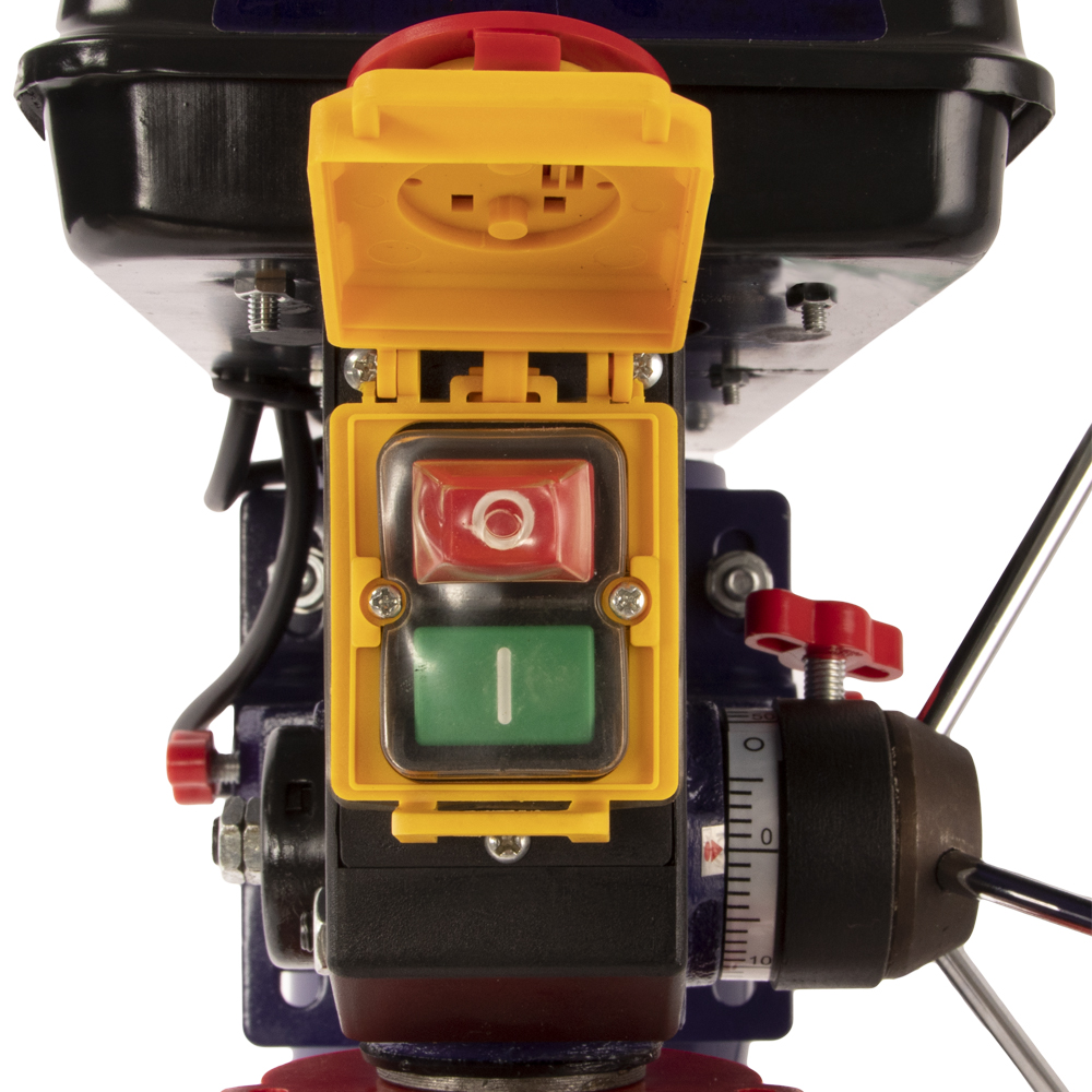- Аварийная кнопка стоп, для быстрой остановки сверлильного станка