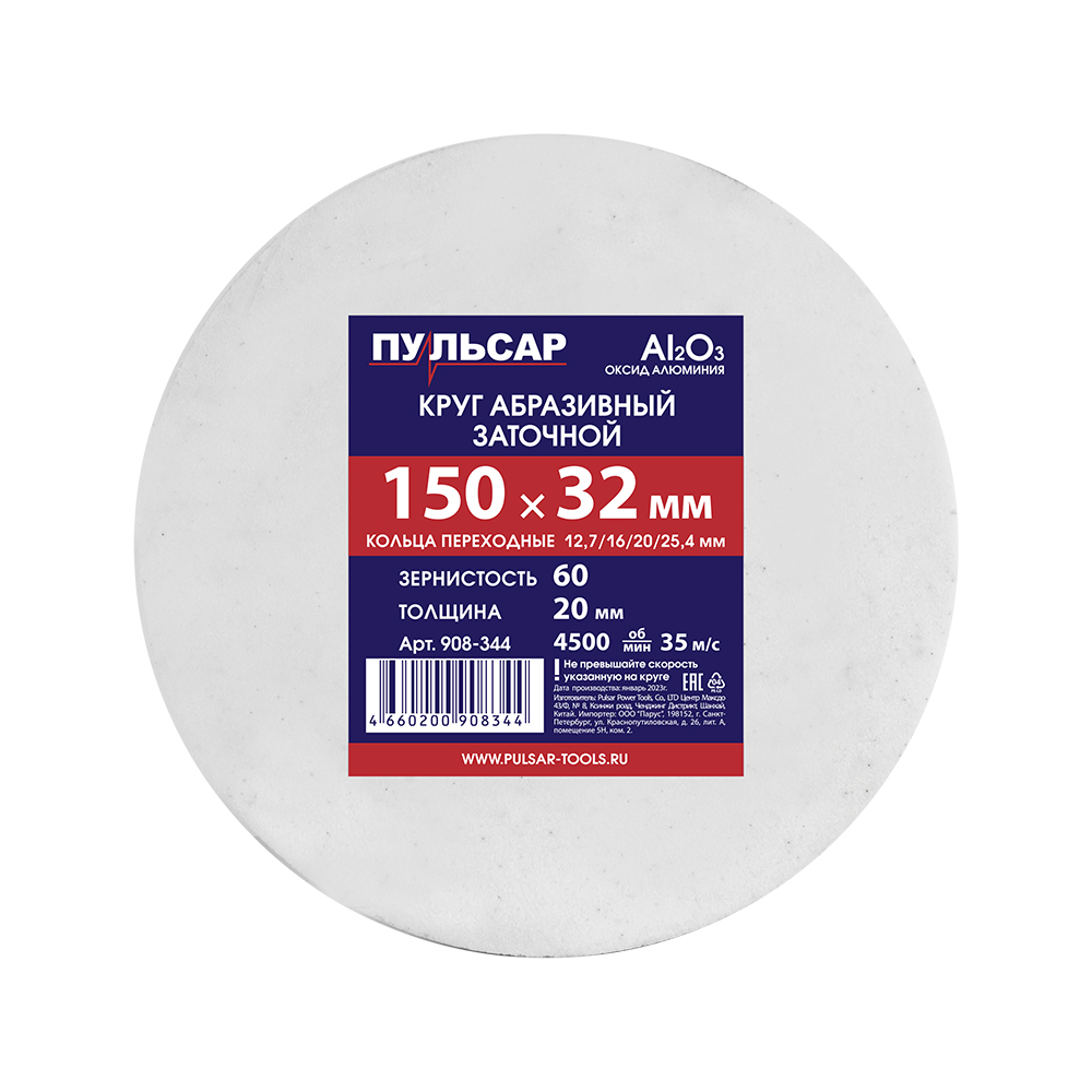 Диск абразивный для точила ПУЛЬСАР 150 х 32 х 20 мм F 60 белый (Al2O3) + кольца переходные
